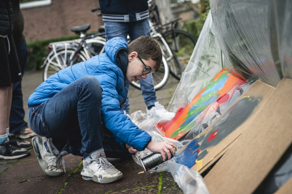 Een enorme muurschildering siert sinds eind november de muur van de portiekflat aan het pleintje bij de Volkshortus aan de Hazelaarstraat. Graffiti-kunstenaar Quinten van Duuren maakte deze samen met buurtbewoners. Quinten vertelt: “De grootte van dit project en de hoogte maakte het een super leuk en uitdagende klus! Met de hoogwerker in de regen en de kou was soms wel een beetje afzien, maar er kwamen regelmatig mensen even buurten en een praatje maken en de vorderingen bekijken.”