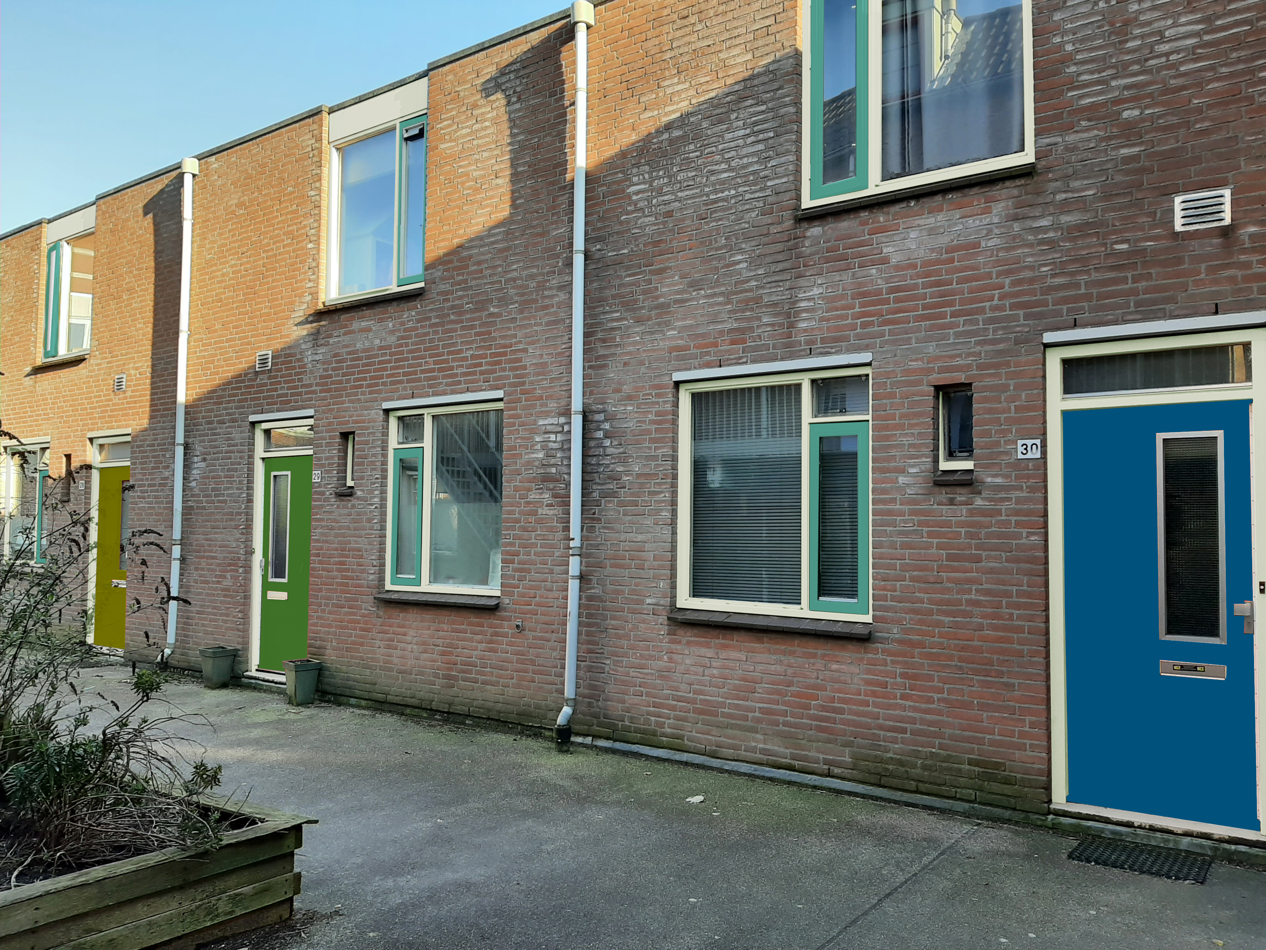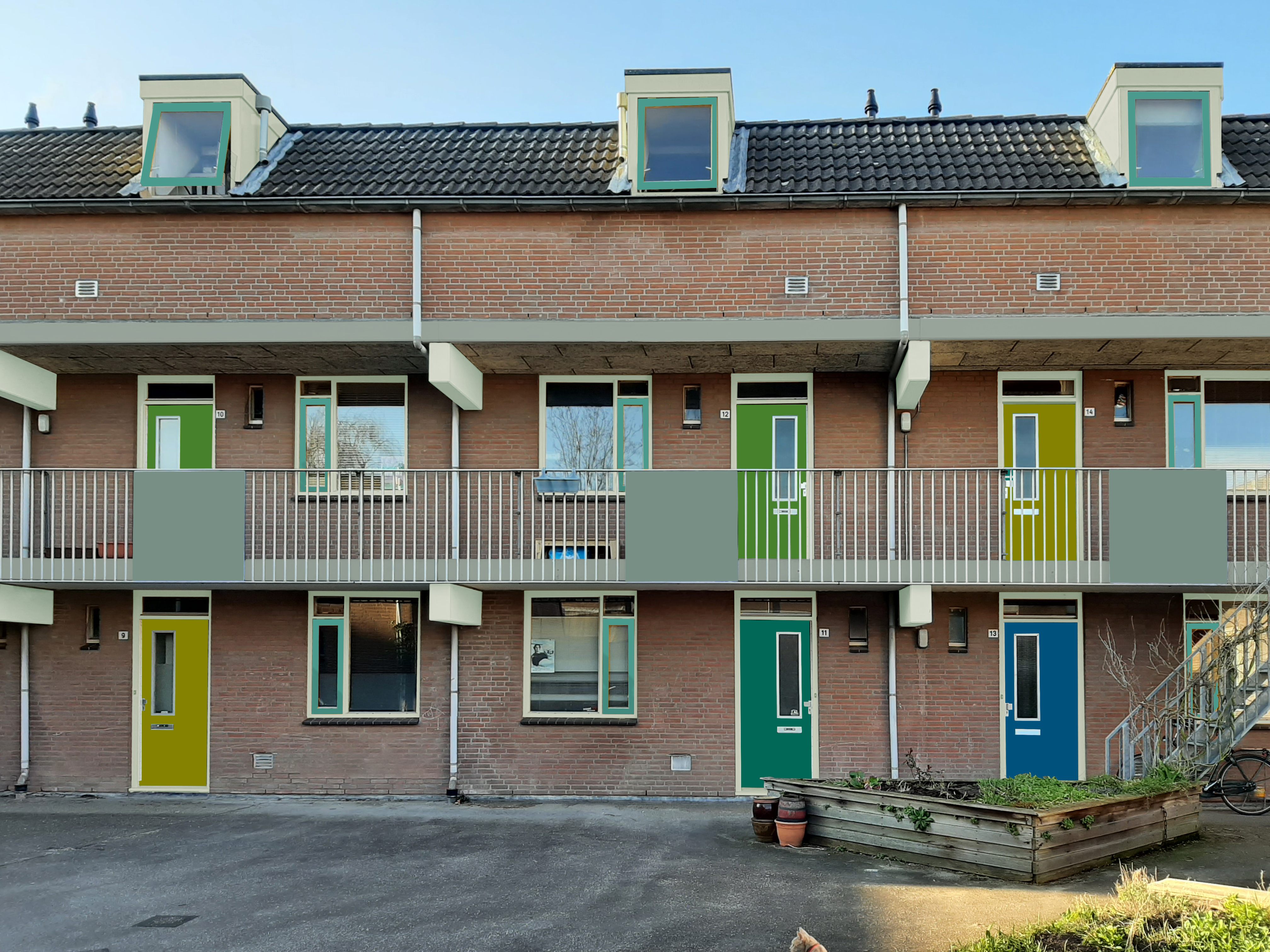 Er zijn 4 kleuren voor de woningdeuren: geelgroen, groen, blauwgroen en blauw. Deze passen bij elkaar en geven een natuurlijk effect. Je kunt stemmen voor jouw eigen voor-, achter- en bergingsdeur.