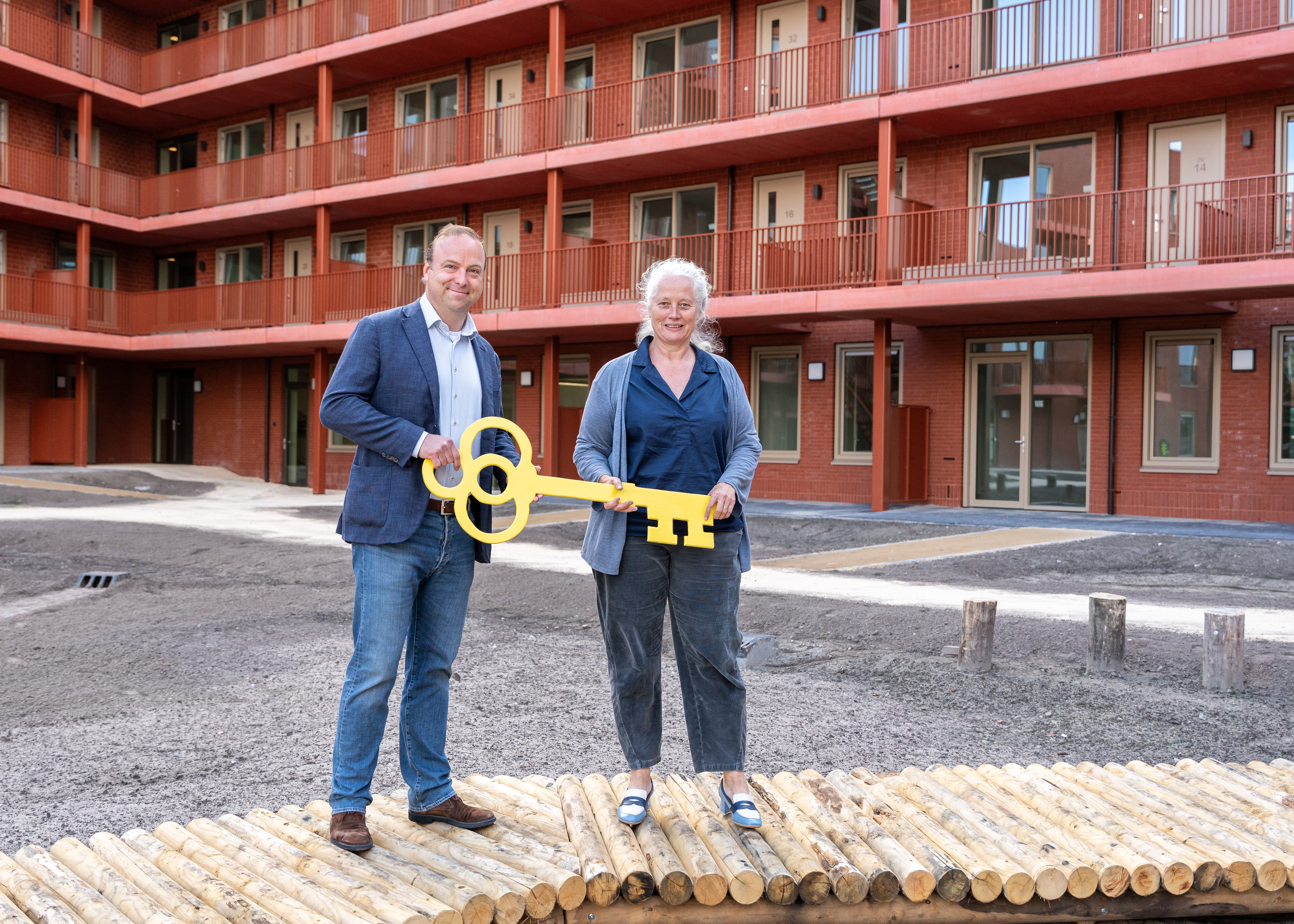 De bouw duurde iets meer dan anderhalf jaar. Esseliene Schieven, directeur/bestuurder van Nijestee, ontving de symbolische sleutel uit handen van Hein Trebbe jr., directeur, bij ontwikkelende bouwer Trebbe. Esseliene: “Wat een bijzondere mijlpaal! Dit nieuwe woongebouw met een heel eigen karakter is een belangrijke stap in de wijkvernieuwing in de Grunobuurt. En de bewoners gaan samen hun eigen buurtje in de stad vormen. Iedereen heeft eigen buitenruimte, maar bewoners delen ook samen een binnentuin.”