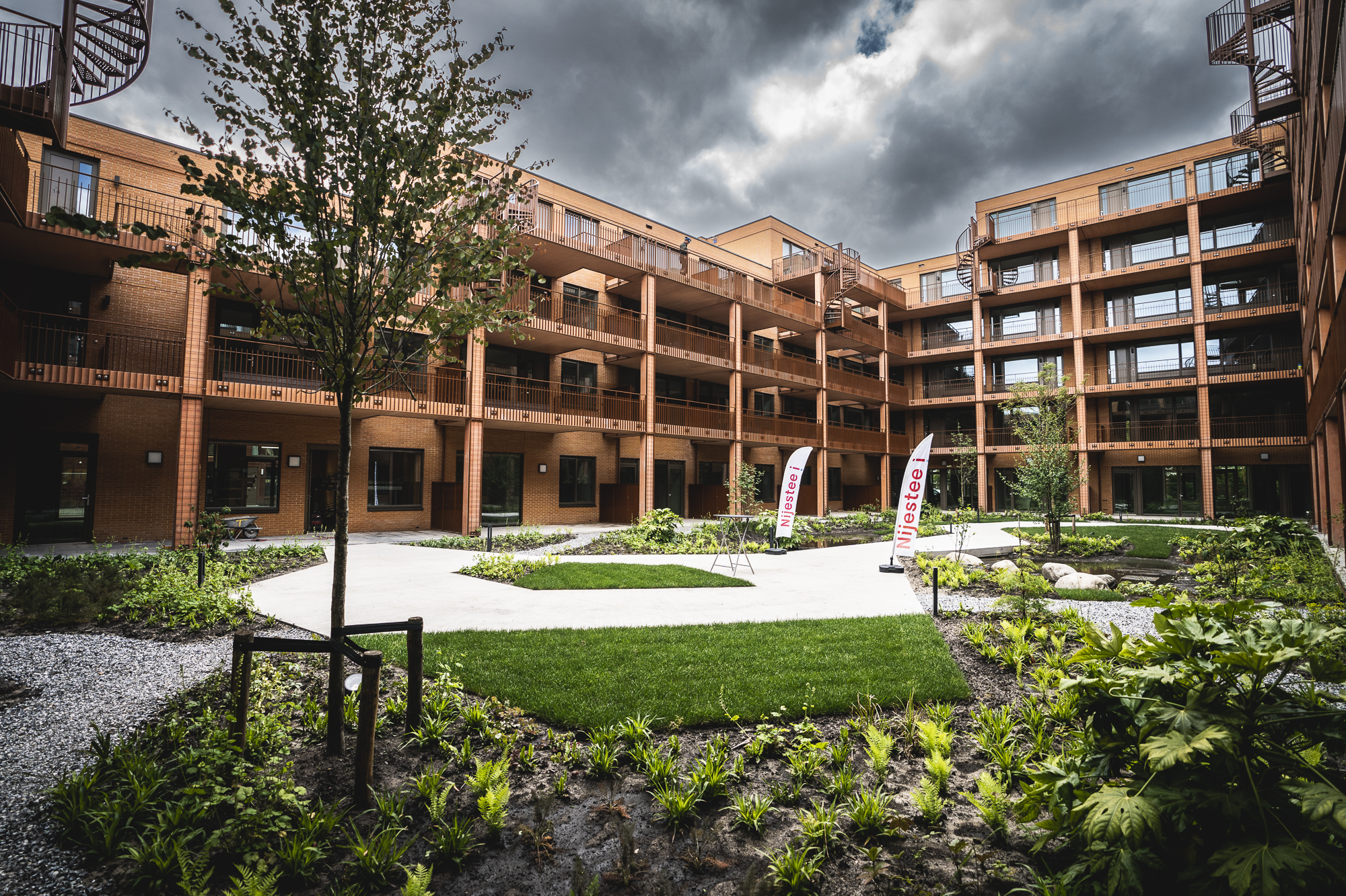 Op het binnenterrein van Regulateur is een prachtige, groene binnentuin aangelegd met voor de bewoners volop ruimte om te verblijven en elkaar te ontmoeten. Ook is er een wadi; een tijdelijke opvang voor regenwater bij hoosbuien. Daarmee voorkomen we dat straten blank komen te staan. Deze spontane uitroep van een omwonende die even kwam kijken, zegt eigenlijk alles: “Wat een mooie binnentuin!”