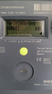 Voor elektra kies je zelf een energieleverancier. Zorg ervoor dat je het contract laat ingaan op de dag van huuringang. Als bewoner geef je zelf aan de leverancier door dat jouw woning zonnepanelen heeft. De energieleverancier stelt jouw voorschotbedrag vast. Controleer elke maand de opbrengsten via jouw energieleverancier. In de meterkast zit een schermpje waarop je de teruggavestand van de elektriciteit kunt zien (zie afbeelding hieronder). Controleer hiermee ook of de zonnepanelen aan staan.