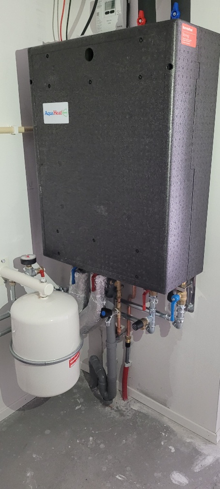 In de technische ruimte zit een warmte-afleverset. Deze is aangesloten op een WKO-systeem (WKO = Warmte Koude Opslag) van WarmteStad. Het haalt warmte en koeling voor de vloerverwarming uit het bronwater in de grond. In de zomer kun je de woning hiermee ook een paar graden koelen. Ook zorgt het WKO-systeem voor warm water in de douche en keuken.